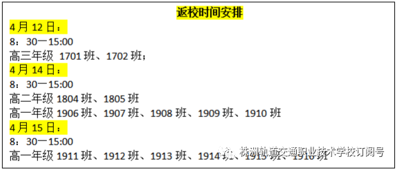 湖南中職株軌根據上級主管部門指導性建議,決定4月12日組織高三年級返校報到。4月14日-15日高二、高一學生錯峰返校報到。為保障師生生命安全,確保全體師生順利、平安返校,逐步恢復正常教學秩序,通知如下: